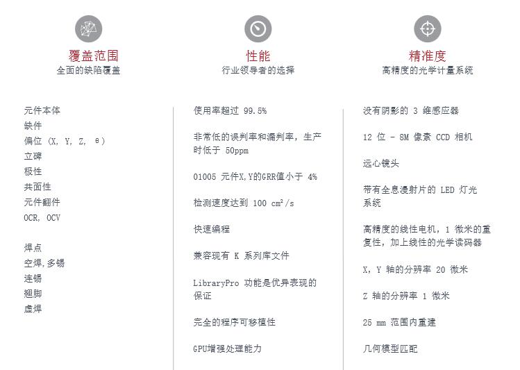 VI 5K 3D AOI 光學(xué)檢測(cè)機(jī) 使用率超過(guò)99.5% 檢測(cè)速度達(dá)到100cm2/s 快速編程 LibraryPro 功能是優(yōu)異表現(xiàn)的保證 完全的程序可移植性 幾何模型匹配