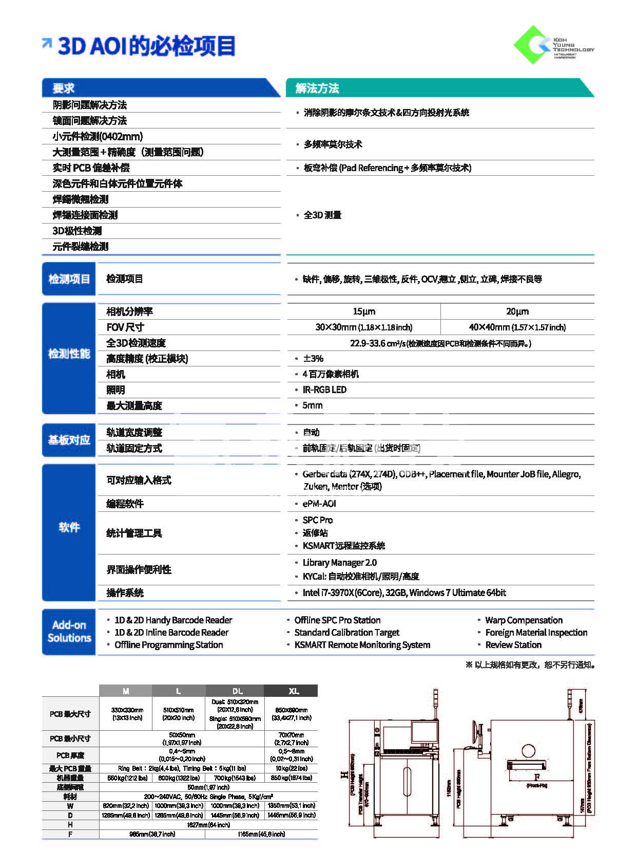 品牌:KOH YOUNG LiTE 3D AOI 性能特點: 全3D AOI,克服二維檢測的缺點 使用4光源投影和多頻率摩爾專利技術(shù)解決陰影 高精度3D焊點檢測