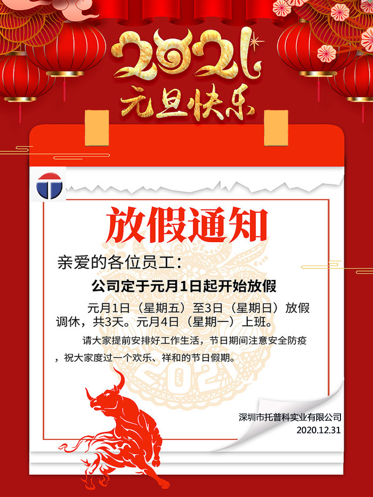 深圳托普科實業(yè)有限公司2021年元旦放假通知