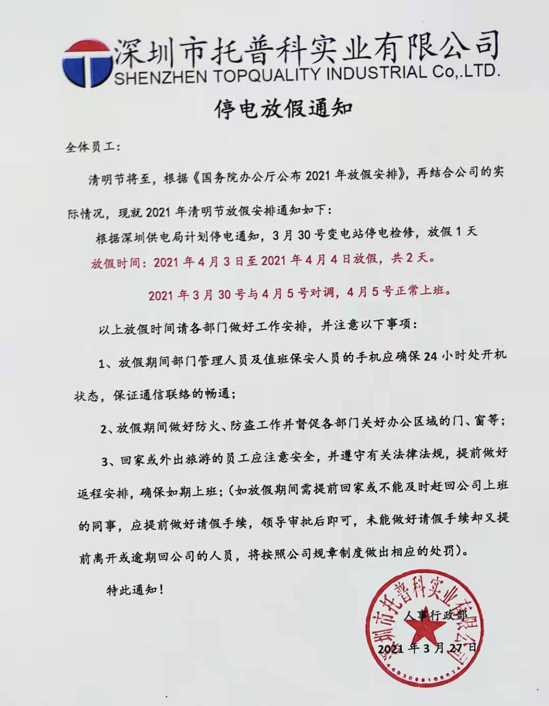 深圳市托普科實業(yè)2021年清明節(jié)放假通知