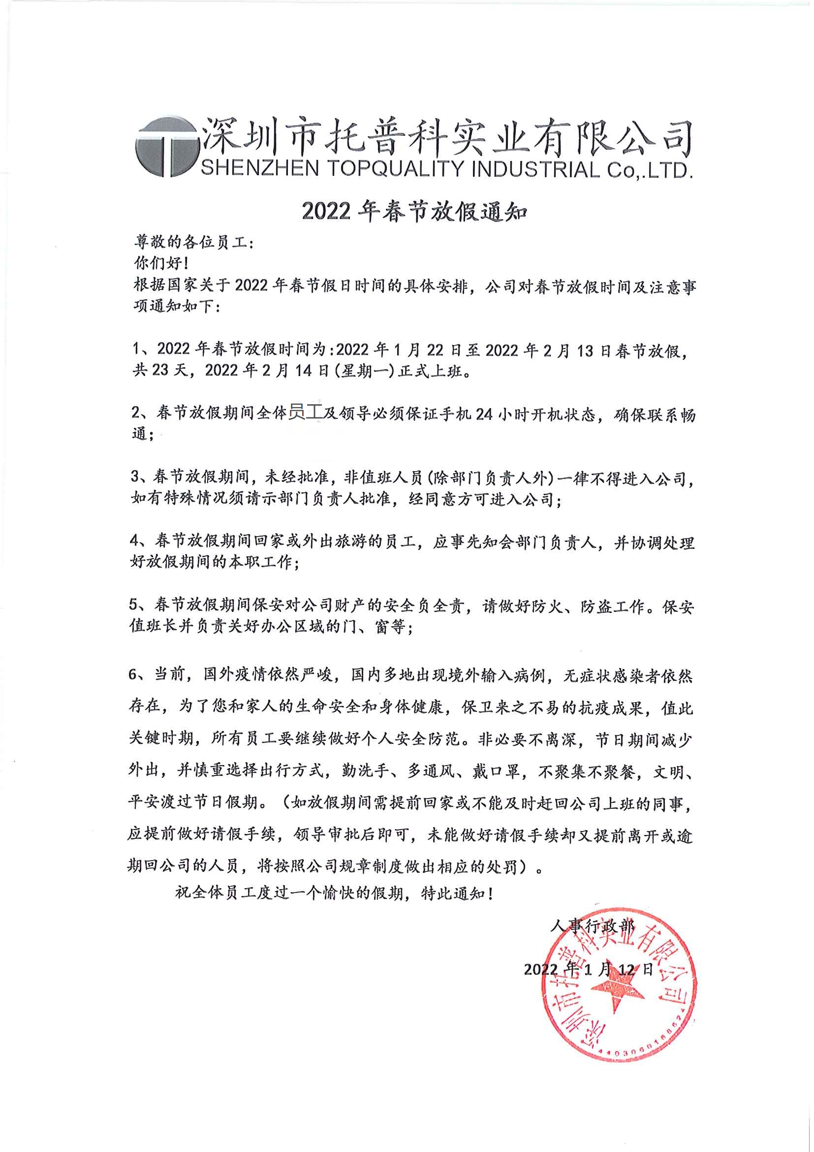 深圳市托普科實(shí)業(yè)2022年春節(jié)放假通知