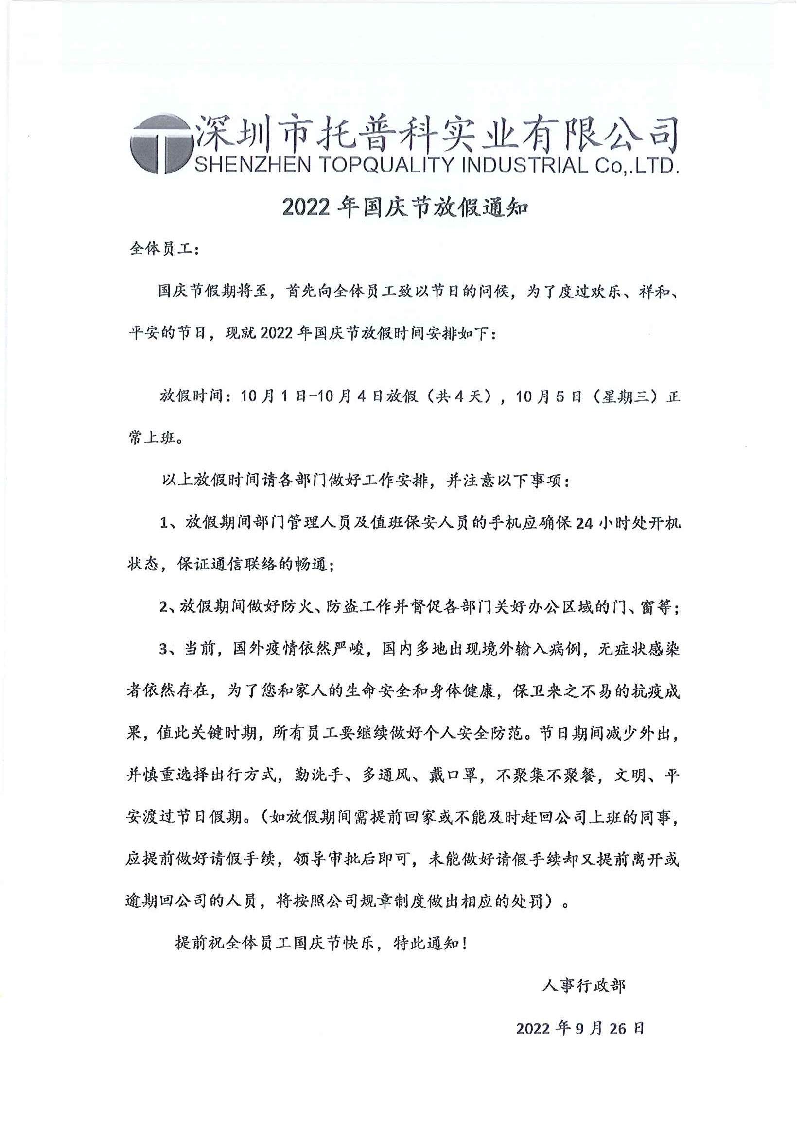 深圳托普科實(shí)業(yè)2022年國慶放假通知