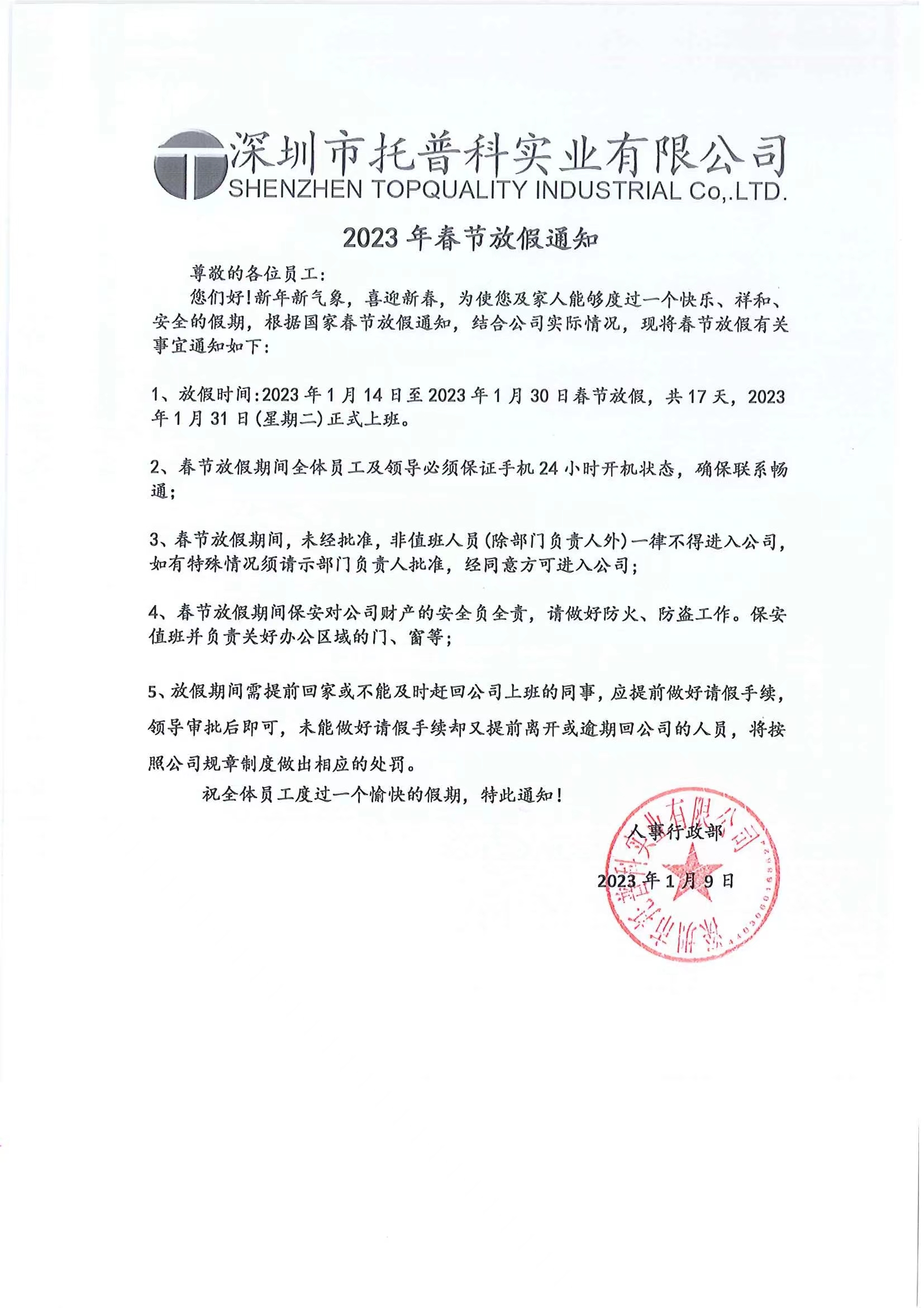 深圳托普科實業(yè)2023年春節(jié)放假通知