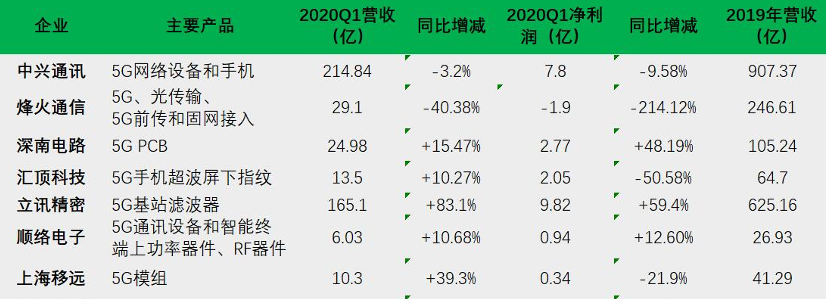 5G商用開始后,受益于5G基站建設(shè)開啟,深南電路、立訊精密、順絡(luò)電子在2020年第一季度營收持續(xù)增長(zhǎng),但是受到疫情影響,中興通信和烽火通信在2020年第一季度營收和利潤(rùn)出現(xiàn)下滑,5G應(yīng)用落地加速,通信模組制造商上海移遠(yuǎn)在2020年第一季度實(shí)現(xiàn)營收增長(zhǎng)。